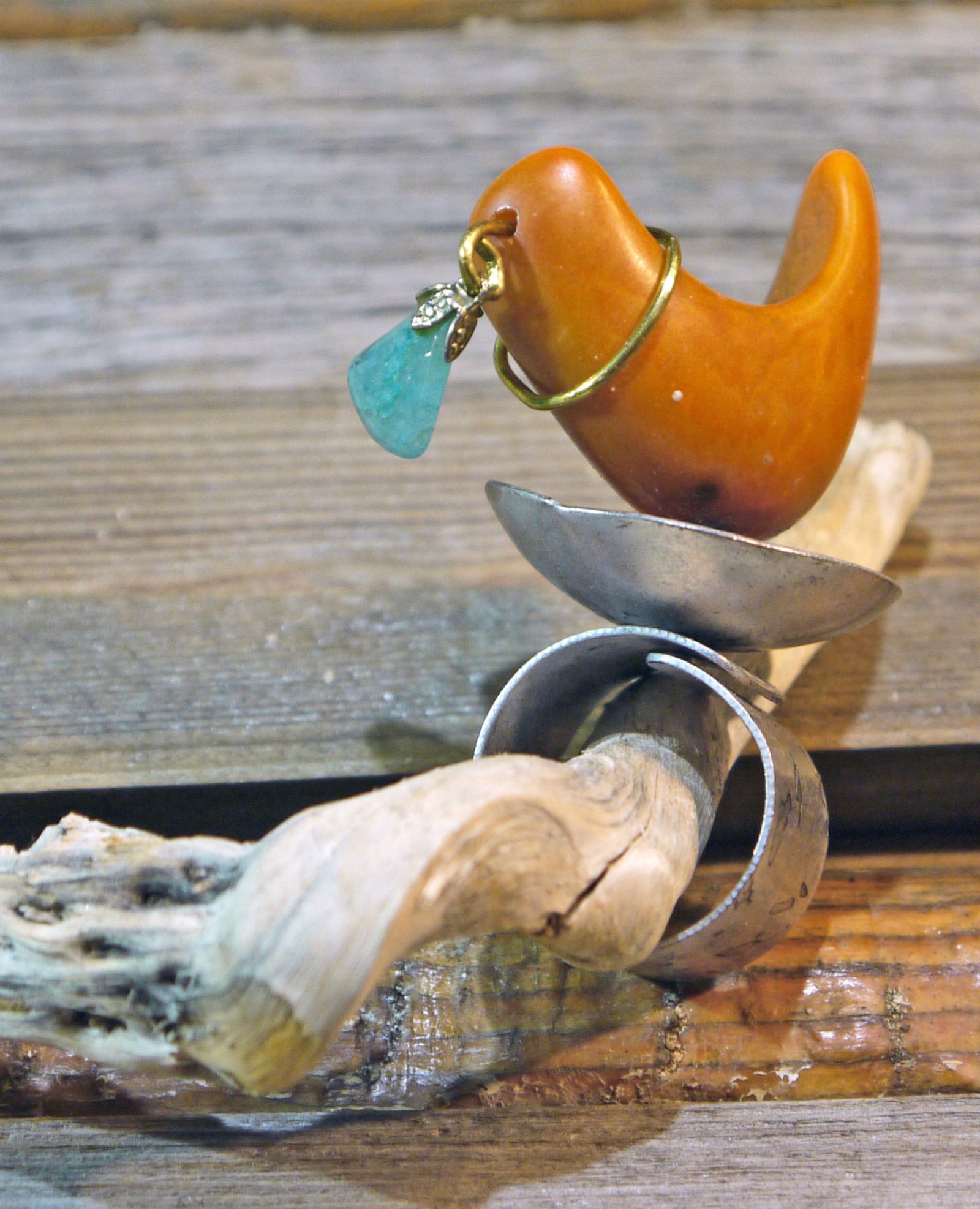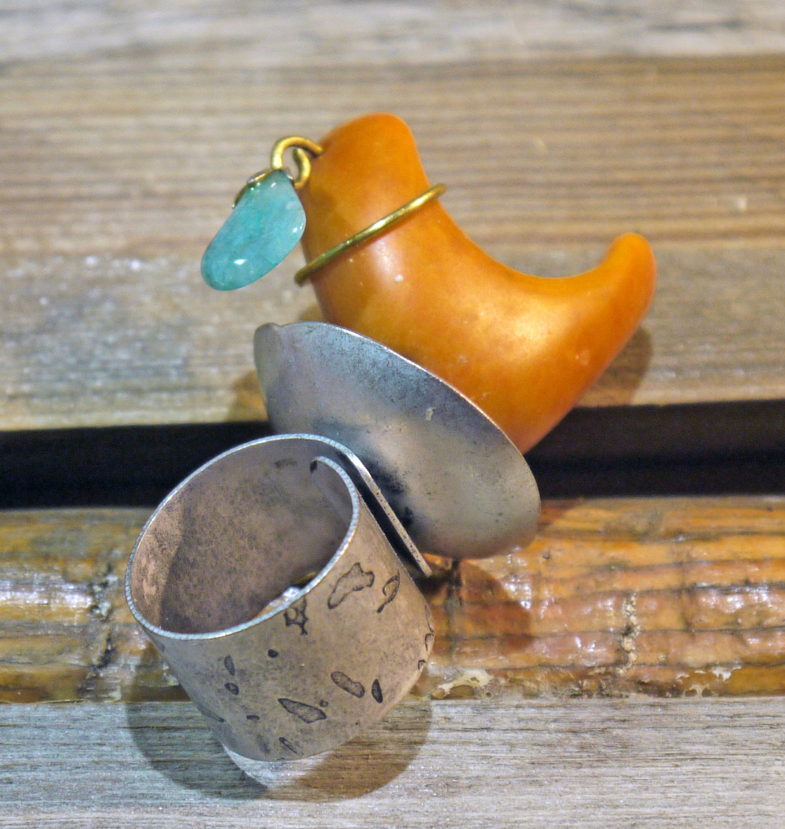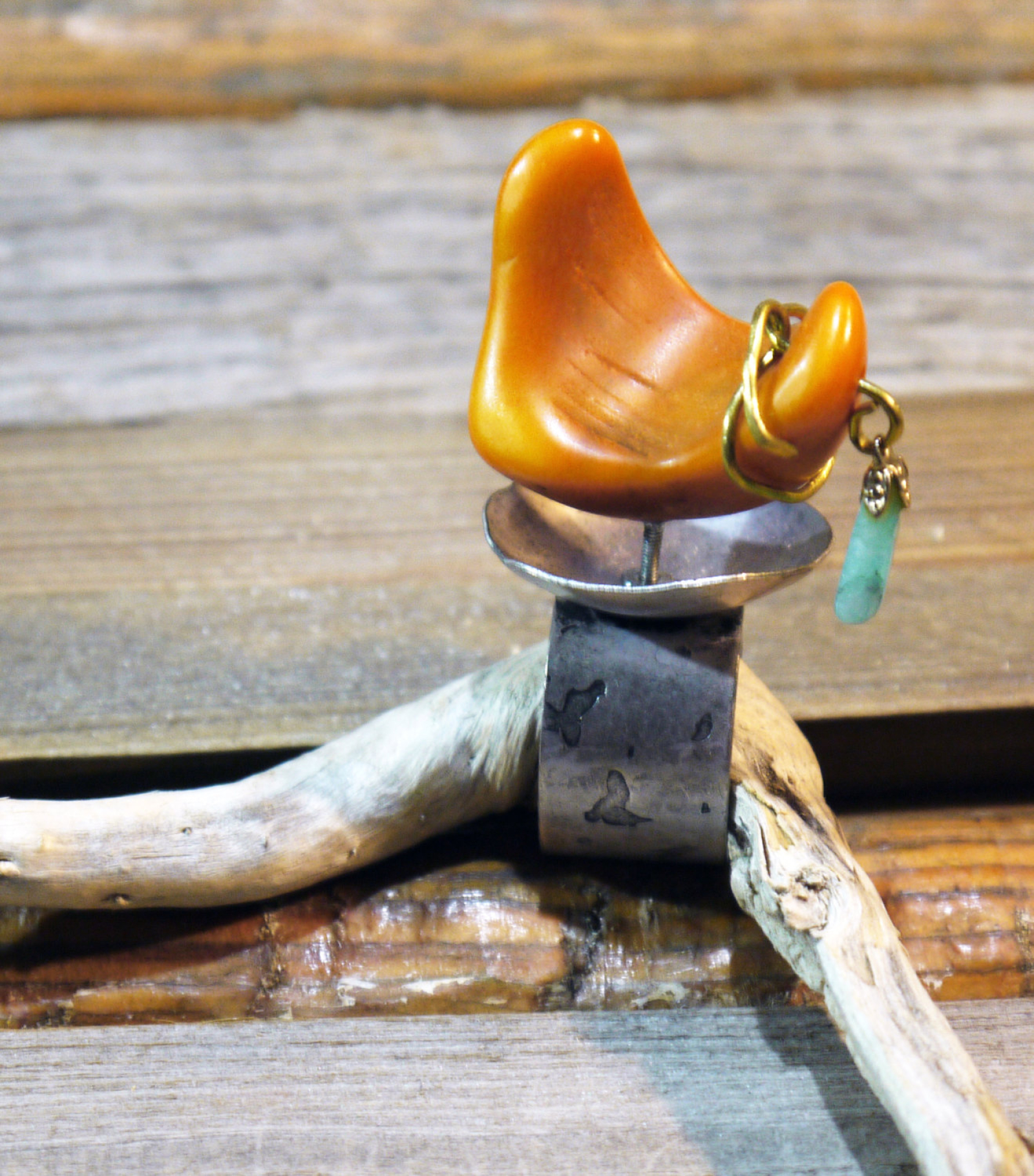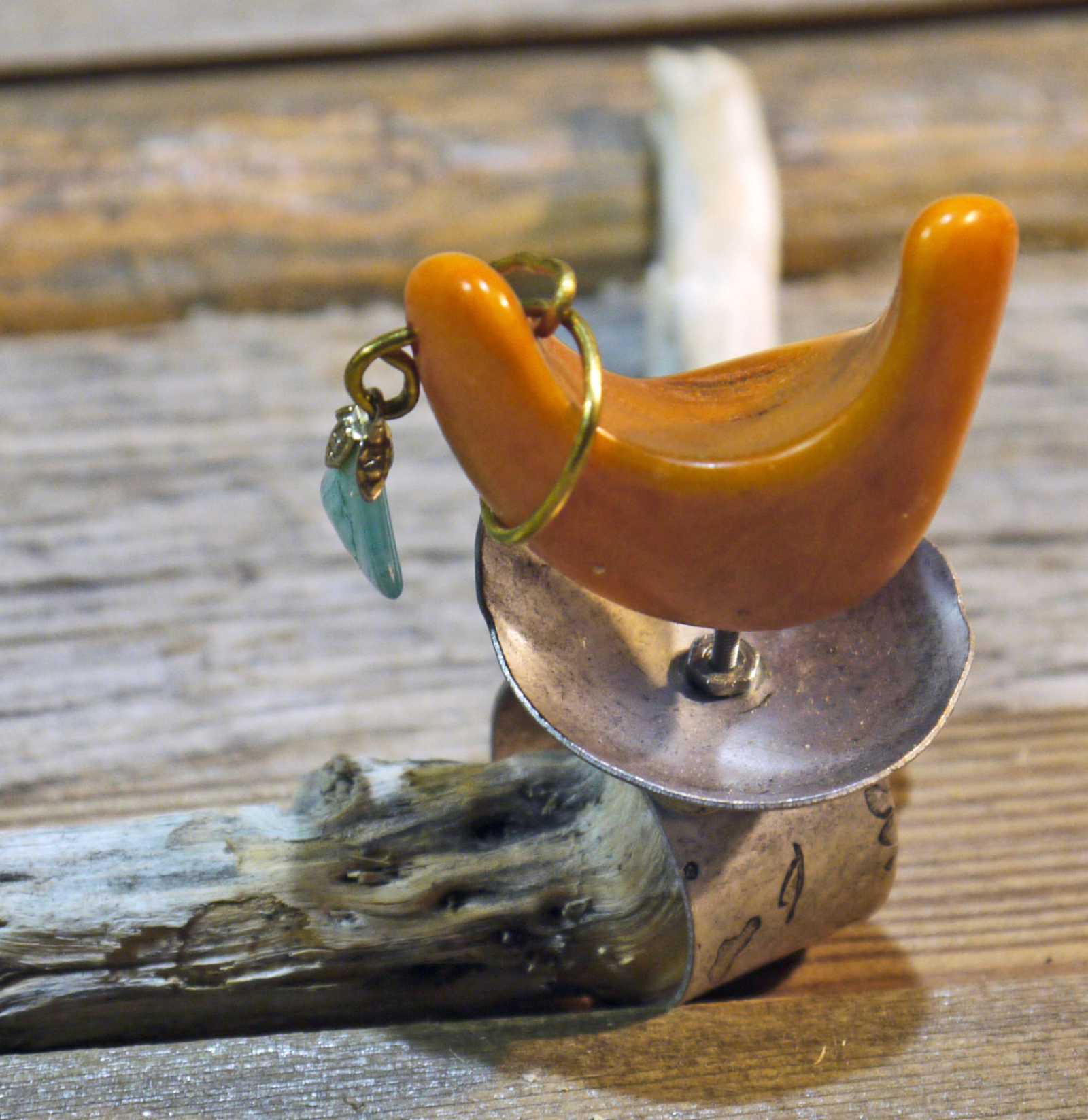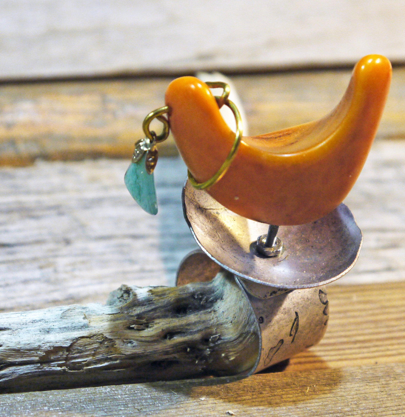 This ring is set up high with a small nut & bolt. Attached is a Brazilian Tagua nut with a hanging turquoise stone wrapped with brass wire. Made of textured silver tone base metal.